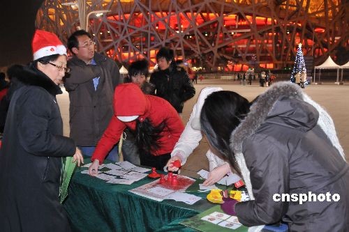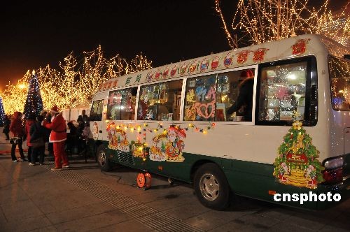 12月24日晚,一輛“圣誕郵車”來到北京奧林匹克公園中心區景觀大道一側,在平安夜為廣大游客服務,給親朋好友送上美好的祝福。中新社發 馮軍 攝