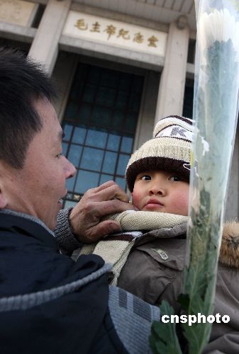 12月26日毛澤東115周年誕辰日清晨,一名四川地震災區的三歲男童與父親到位于北京天安門廣場的“毛主席紀念堂”敬獻白菊鮮花,深切懷念偉大領袖毛主席。