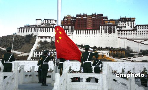 西藏:1月1日上午10點,西藏自治區黨政軍及各屆人士在布達拉宮廣場舉行“升國旗唱國歌”儀式歡慶新年。中新社發 賈長飛 攝