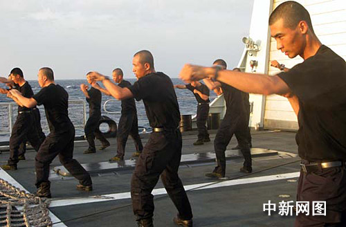 圖:“海口”艦隨艦特戰隊員進行晨練