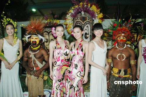 圖為來自巴布亞新幾內亞的蘭花參展商在展臺前展示本國獨特的民族文化,吸引參會模特們合影留念。中新社發 尹海明 攝