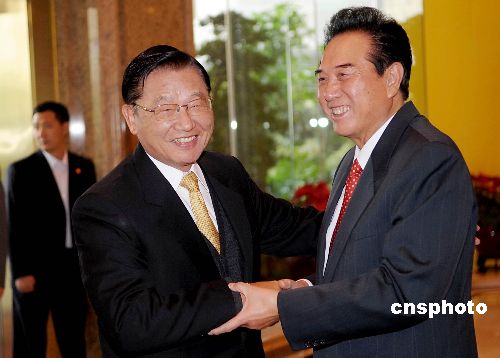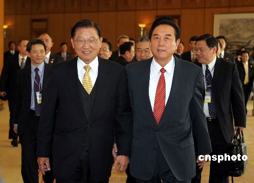 一月七日下午,海峽兩岸關系協會會長陳云林在深圳五洲賓館,會見臺灣海峽交流基金會董事長江丙坤率領的海基會臺資企業考察團,兩會就臺企應對金融危機交換意見。中新社發 陳文 攝