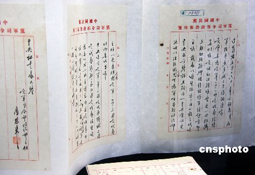 圖為周恩來擔任國民黨黨軍司令部政治部主任時,于一九二五年七月致中央秘書處的函。中新社發 陳立宇 攝