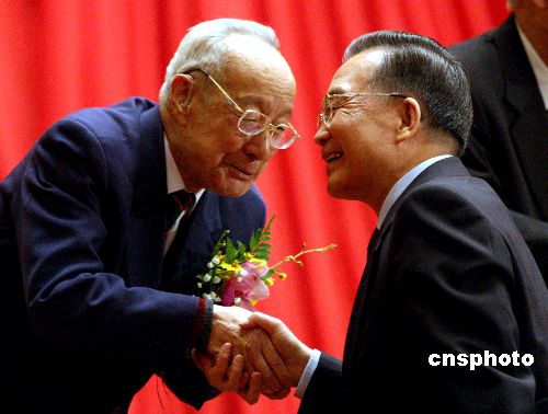 溫家寶總理向科技工作者表示祝賀和敬意。中新社發 宋吉河 攝
