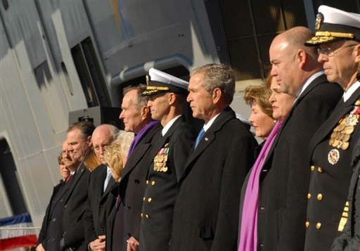 美國總統(tǒng)布什與親近家人及高層官員,參加核子動力航空母艦“布什號”(USS George H.W. Bush)下水服役儀式。