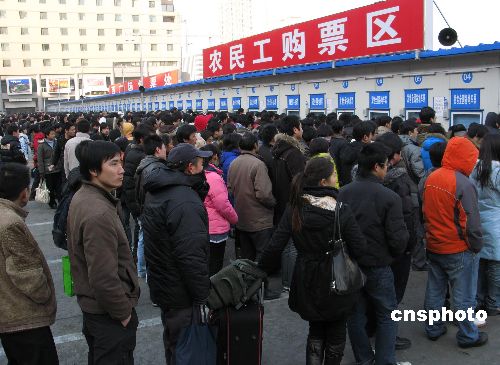 1月15日,北京西站廣場春運農民工售票窗口前,成千旅客提前多天排隊購買返鄉列車票,購票秩序良好。北京西站迎來春運“農民工返鄉流、學生流、探親流”的客流高峰,預計春運期間每天到發旅客列車約280多列,客流高峰時可達20萬人次,平均每五分鐘發一趟列車。中新社發 鄒憲 攝