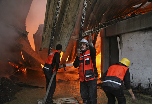 1月15日,巴勒斯坦消防人員為遭以軍炮擊后起火的聯合國駐加沙的辦公機構滅火。