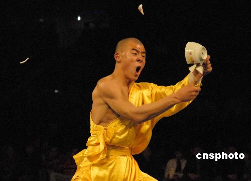 圖中武僧用一根手指連破十來個瓷碗,令觀眾嘆為觀止。中新社發 劉冉陽 攝