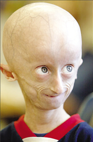 據報道,現年14歲的美國男孩塞斯·庫克是美國華盛頓州西雅圖附近達令頓地區人,和《返老還童》中的男主人公本杰明一樣,他出生時就沒有毛發,皮下脂肪退化,皮膚血管清晰可見,如同一名70歲老人一般衰老。當塞斯18個月大時,他被診斷出患有罕見的早衰癥。37歲的父親凱爾·庫克說:“一開始我們聽到這個消息簡直驚呆了,我們不敢相信這一切。”