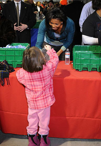 馬丁·路德·金全國紀念日,奧巴馬的夫人米歇爾在華盛頓的一個體育館內幫助一名小志愿者。