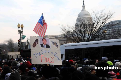 圖為在國(guó)家大草地的觀禮民眾打出布什被扔鞋的窘相并寫著:“錯(cuò)誤的最后終結(jié)”!中新社發(fā) 邱江波 攝