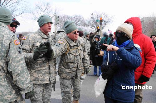 為應付突發事件,協助警方維持秩序,當局出動萬名國民警衛隊官兵站立街頭,協助維持就職典禮秩序。圖為士兵為迷路者指路。中新社發 邱江波 攝