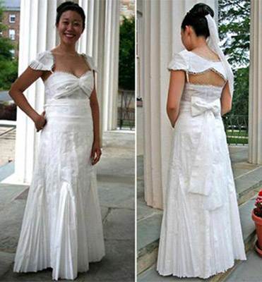 2007年12月19日美國(guó)肯塔基州的新娘珍妮佛·卡農(nóng)與新郎多伊·尼科爾斯卻在紐約時(shí)代廣場(chǎng)的一個(gè)公共廁所內(nèi)舉行了婚禮。更讓所有人目瞪口呆的是,當(dāng)天珍妮佛身上所穿的婚紗,竟全部是用衛(wèi)生紙制作而成!
