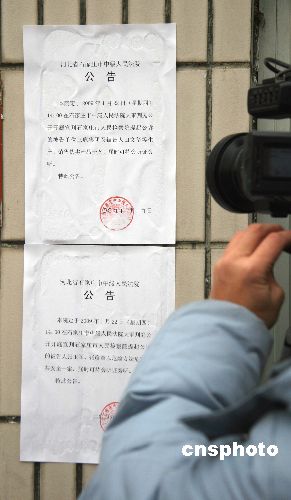 圖為法院門口張貼關(guān)于下午兩點(diǎn)開(kāi)庭宣判三鹿集團(tuán)及田文華等生產(chǎn)、銷售偽劣產(chǎn)品一案和張玉軍、張彥章以危險(xiǎn)方法危害公共安全案的公告。中新社發(fā) 翟羽佳 攝