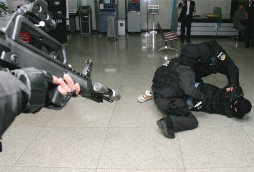 圖:北京警方開展銀行系統(tǒng)防搶劫演練(2)