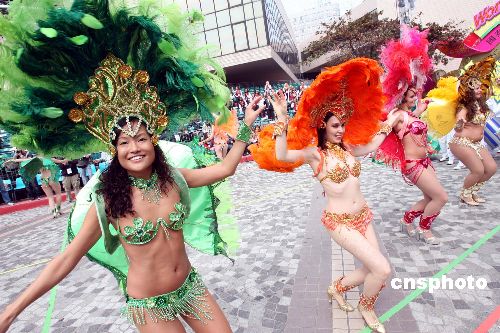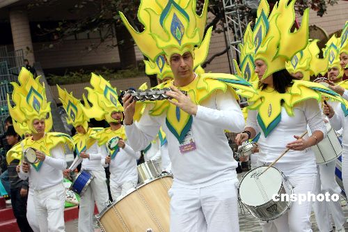 一月二十五日,前來(lái)香港參加新春國(guó)際匯演之夜的多支隊(duì)伍在文化中心廣場(chǎng)進(jìn)行彩排,丹麥桑巴舞演員身穿華麗舞衣,配合熱情奔放的音樂(lè),點(diǎn)燃現(xiàn)場(chǎng)歡樂(lè)氣氛。由香港旅發(fā)局主辦的“2009國(guó)泰航空新春國(guó)際匯演之夜”將在大年初一晚舉行。中新社發(fā) 洪少葵 攝