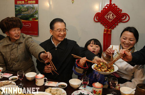 1月25日,溫家寶總理在汶川映秀鎮板房安置小區吳志遠家吃年夜飯。這是溫家寶請大家品嘗他剛炒出的回鍋肉。1月24日至25日,中共中央政治局常委、國務院總理溫家寶來到四川受災最為嚴重的北川、德陽、汶川等地,和災區人民一起過年。作者:姚大偉