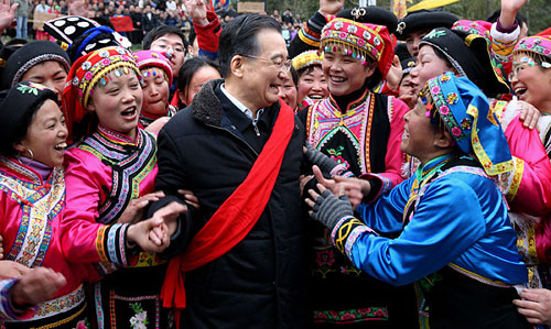 1月24日至25日,中共中央政治局常委、國務院總理溫家寶來到四川受災最為嚴重的北川、德陽、汶川等地,和災區人民一起過年。這是1月24日,溫家寶在北川縣擂鼓鎮貓兒石村看望羌族群眾。作者:姚大偉