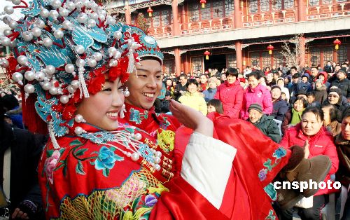 1月27日 (大年初二),北京大觀園十四屆紅樓廟會(huì)吸引眾多假日游客,本屆廟會(huì)以弘揚(yáng)中華傳統(tǒng)文化為宗旨,以展現(xiàn)紅樓文化為主題,呈現(xiàn)出改革開放30年來(lái)新北京、新宣武的精神風(fēng)貌。廟會(huì)主要活動(dòng)有“元妃省親”、“寶黛成婚”“賈母賀壽”、紅樓文化展覽--木版年畫展、紅樓夢(mèng)人物火花展以及紅樓美食展示區(qū)等。圖為在北京大觀園2009年紅樓廟會(huì)上別具創(chuàng)意的“寶黛成婚”。中新社發(fā) 錢興強(qiáng) 攝
