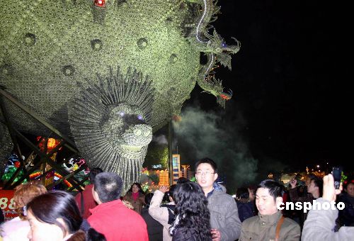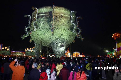 圖為逾30萬只景德鎮瓷器綁扎而成的巨大“九龍鼎”,重近百噸,游客嘆為觀止。中新社發 黃永莉 攝