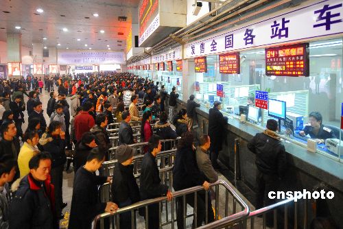 2009年2月1日消息,成都車站今年春運在原有67個售票窗口的基礎上新增臨時窗口50個,新開設客票代售點143個,有效分流車站售票壓力。今年成都車站節(jié)后春運“買票難”得到明顯緩解。中新社發(fā) 曹寧 攝