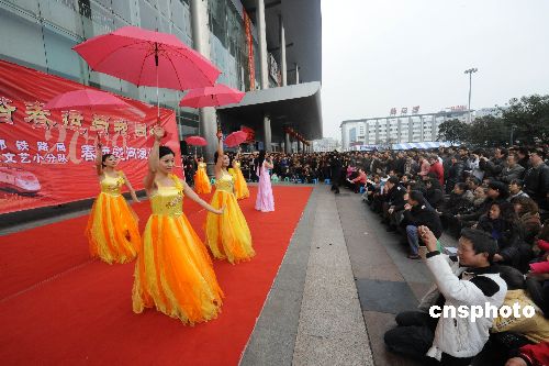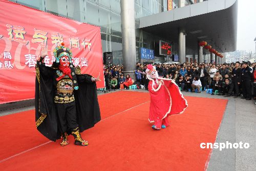 2009年2月3日,成都鐵路局文藝演出小分隊(duì)來(lái)到成都火車站進(jìn)行慰問(wèn)演出,為等候乘車的旅客們表演了歌舞、獨(dú)唱、川劇變臉等節(jié)目,祝大家愉快出行、一路順風(fēng)。中新社發(fā) 曹寧 攝
