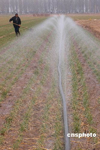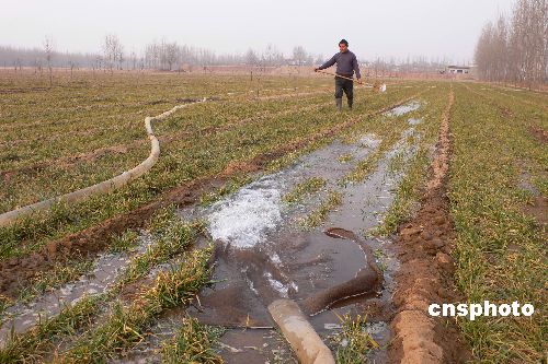 2月3日下午,開封市仙人莊村農民在田間澆灌小麥。面對嚴重的旱情,河南省開封市各縣區積極組織群眾迅速行動,做好以抗旱澆麥為重點的麥田管理工作,力爭今年夏糧豐收。