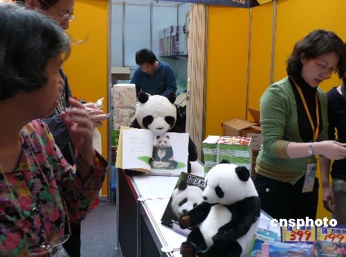 圖為大陸贈臺大熊貓“團團”“圓圓”到臺灣后,熊貓形象成為本屆書展新寵,畫冊、玩偶、游戲等展品琳瑯滿目。中新社發 路梅 攝