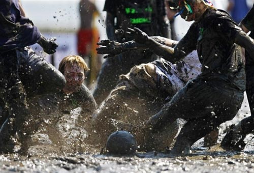 泥地足球:德國北部海邊小鎮Brunsbuettel的泥灘上進行的泥地足球賽。男女“球員”混合在一起,泥地中盡情撒野。