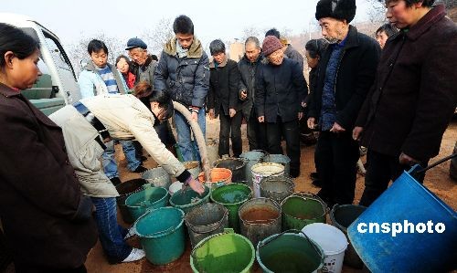 汝陽縣城關(guān)鎮(zhèn)張河村,村民們正在用各種裝水工具接鎮(zhèn)政府送來的飲用水。中新社發(fā) 高山岳 攝