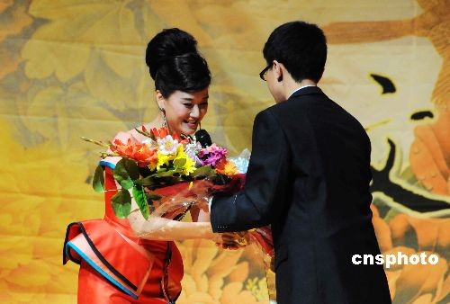 圖為熱情的華盛頓“英迷”走上舞臺向宋祖英獻花。中新社發 邱江波 攝