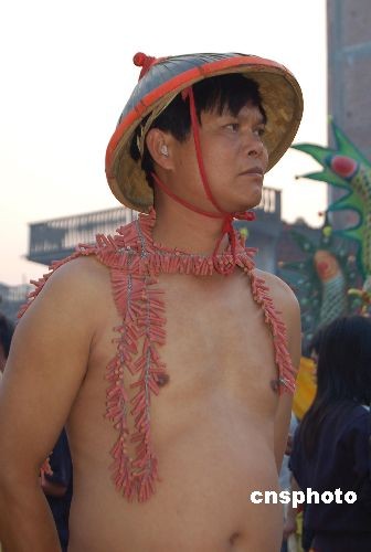 廣西賓陽“炮龍節”上全副武裝的“炸龍人”。