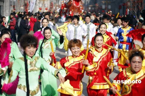 2月9日上午,來自北京、河北、山東等3個省市的12支花會隊,在前門大街舉行“傳統民間花會踩街”活動,喜迎正月十五元宵節的到來。踩街是一種中國傳統民間民俗藝術表演形式,類似國外的花車游行,表演隊伍邊行進邊表演,游客沿途觀看。花會隊從正陽門箭樓南側和前門五牌樓出發,16只南獅和北獅為大隊人馬開道,隨后中幡、旱船、二魁摔跤、地秧歌、鼓子秧歌等將依次向珠市口行進。