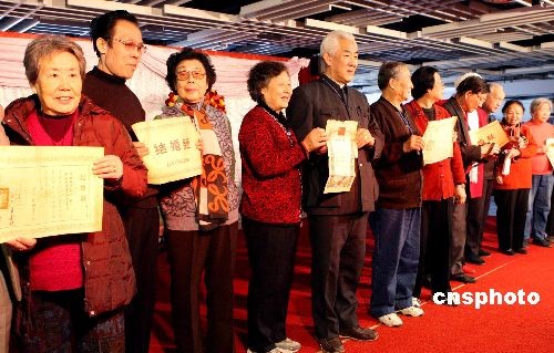 圖為在活動上長者們手捧政府當年頒發的不同版本的結婚證相互祝福。中新社發 錢興強 攝