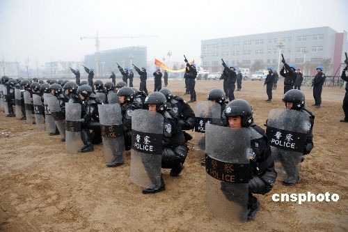 2月12日下午,河北廊坊開始下起小雨,由山東公安邊防總隊組建的中國第八支赴海地維和警察防暴隊在雨中進行處置群體性事件訓練。中新社發 由永懷 攝