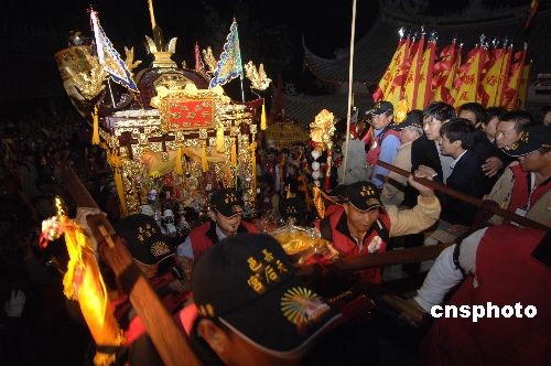 2月13日,臺灣信眾抬媽祖神像到湄洲島媽祖祖廟進香謁祖。當日,428名臺灣媽祖信眾第一次經由海上客運直航抵達湄洲島媽祖祖廟進香謁祖。這是2008年底海峽兩岸簽訂“兩岸海運協議”后的第一個兩岸海上客運直航活動,也是湄洲島口岸繼與金門、馬祖實現海上客運通航后的又一突破。中新社發 王東明 攝