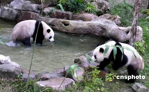 圖為“團團”“圓圓”在戶外展場的水池內戲水玩耍。中新社發 路梅 攝