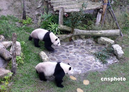 圖為“團團”“圓圓”在戶外展場閑庭信步。中新社發 路梅 攝