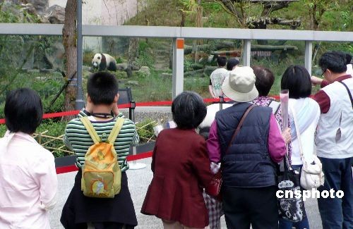 圖為觀眾排隊依次參觀在戶外活動的大熊貓。中新社發 路梅 攝