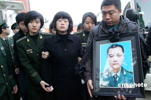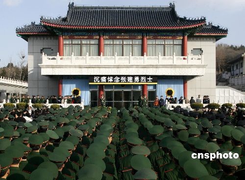 2月14日上午,張建勇烈士遺體告別儀式在北京八寶山殯儀館舉行,北京市相關單位負責人以及烈士親屬、戰友、生前好友600余人參加。2月10日凌晨1時40分,北京市公安局消防局朝陽支隊紅廟中隊指導員張建勇,在撲救央視新址附屬文化中心在建工地重大火災中壯烈犧牲,離他30歲生日僅有16天。2月12日,中國公安部批準張建勇為革命烈士。中新社發 富田 攝