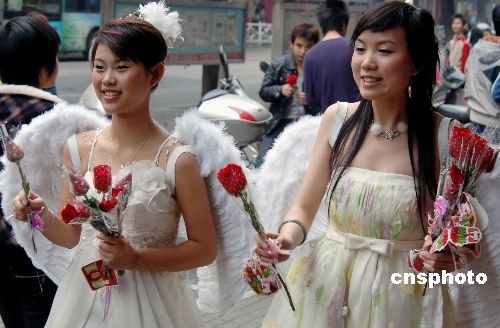 二月十四日情人節(jié),為搶占商機(jī),兩名由商家女服務(wù)生裝扮成的“天使”,在福州市區(qū)街頭向過往的男女青年贈送玫瑰花,成為街頭亮麗一景。中新社發(fā) 劉可耕 攝