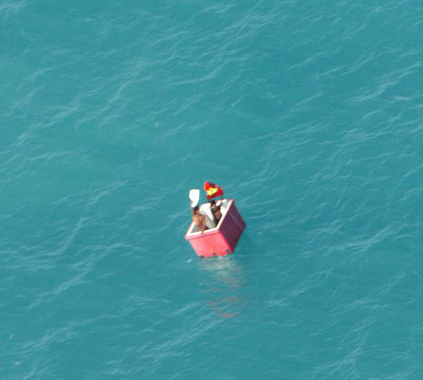 08年12月23日,兩個緬甸漁民的漁船在澳洲北部海岸外翻覆,船上20人落海。他們兩人擠進面積只有一張小桌子大的冰桶里,在鯊魚出沒的海上漂流了25天,才被澳洲海岸巡防隊的飛機發現。