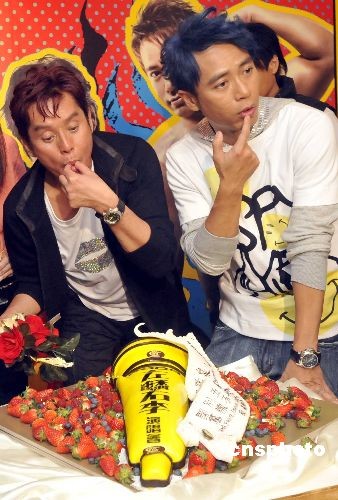 二月十四日晚,“香港二零零九東亞運動會.左麟右李演唱會”在香港紅磡體育館作尾場演出。圖為十五日凌晨譚詠麟、李克勤在演唱會結束后出席慶功會。中新社發 鄧慶樂 攝