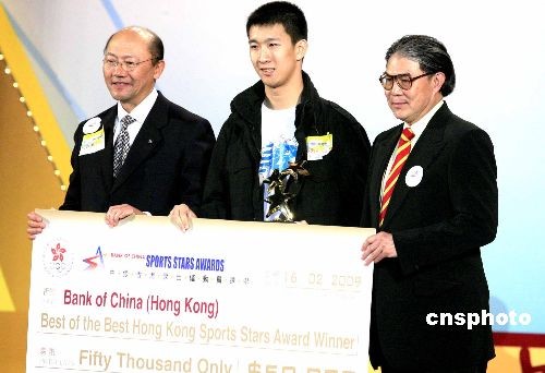 二月十六日,“2008中銀香港杰出運動員選舉”得獎結果在香港會展中心舉行的頒獎典禮上揭曉。圖為國際奧委會委員、中國香港體育協會暨奧林匹克委員會會長霍震霆(右一)等為“中銀香港星中之星香港杰出運動員大獎”獲獎者蘇樺偉(中)頒獎。中新社發 張勤 攝