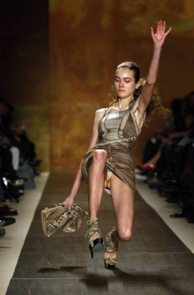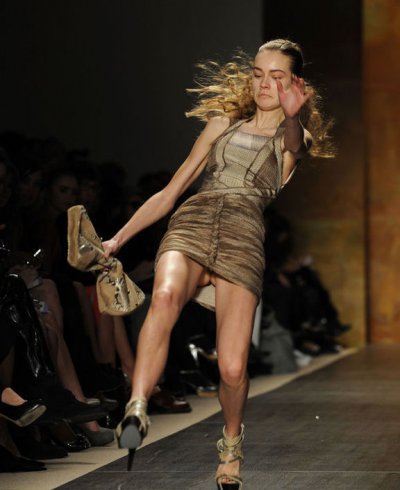 2月13日-15日,在紐約時尚周上,不斷有模特走秀時出現尷尬鏡頭,或者把鞋走丟,或者失足走光。