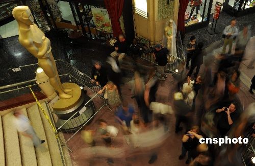 當地時間二月二十日,大批游客在好萊塢柯達劇場入口處的奧斯卡金像模型前留影。全球影迷矚目的第八十一屆奧斯卡電影金像獎頒獎典禮將于二十二日晚在這里舉行,柯達劇場內外打扮一新,通往劇場的巨大紅地毯已經鋪就,各項準備工作基本就緒。中新社發 張煒 攝