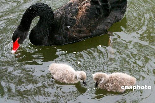 2009年2月21日,古城蘇州春風(fēng)送暖,陽光明媚,蘇州動物園里兩只剛出生半個多月的黑天鵝寶寶由其鵝爸、鵝媽的引領(lǐng)下,舉家進入池塘戲水覓食,為游客增添了許多游園情趣。中新社發(fā) 王建中 攝