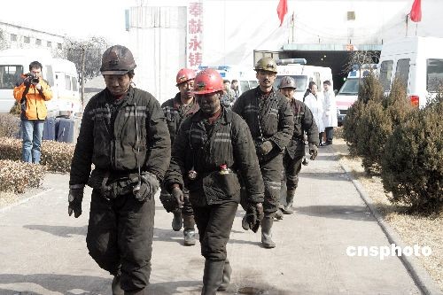 二月二十二日凌晨二時十七分,山西焦煤集團西山煤電屯蘭煤礦發生瓦斯爆炸事故,目前已造成四十四人遇難。圖為已安全升井的礦工。中新社發 張云 攝
