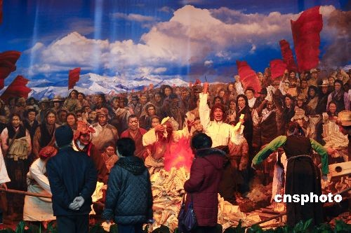 2月24日,“西藏民主改革50年大型展覽”在北京民族文化宮開(kāi)幕。展覽分為和平解放西藏,平息武裝叛亂,西藏的民主改革,50年來(lái)統(tǒng)一與分裂、進(jìn)步與倒退的斗爭(zhēng),經(jīng)濟(jì)社會(huì)發(fā)展和人權(quán)事業(yè)的巨大成就等5部分,包含500多幅圖片和180多件實(shí)物、文獻(xiàn)檔案。展覽將持續(xù)一個(gè)半月。展覽再現(xiàn)獲得解放的農(nóng)奴焚燒契書(shū)的場(chǎng)景,吸引不少觀眾。中新社發(fā) 盛佳鵬 攝