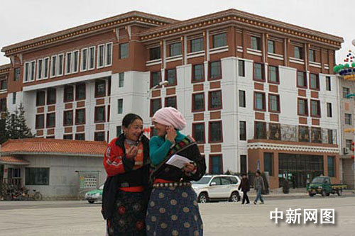 中新網2月24日電 2月24日,兩名藏族群眾從甘南藏族自治州合作市一棟藏式建筑前經過。這座高原羚城對全市28棟新建、續建、擴建建筑物進行了民族特色風貌式樣控制和改造,還將民族特色化建設延伸和輻射到農牧村,力爭把草原新城合作市打造成甘肅、青海、四川藏區一流的民族文化特色城市。